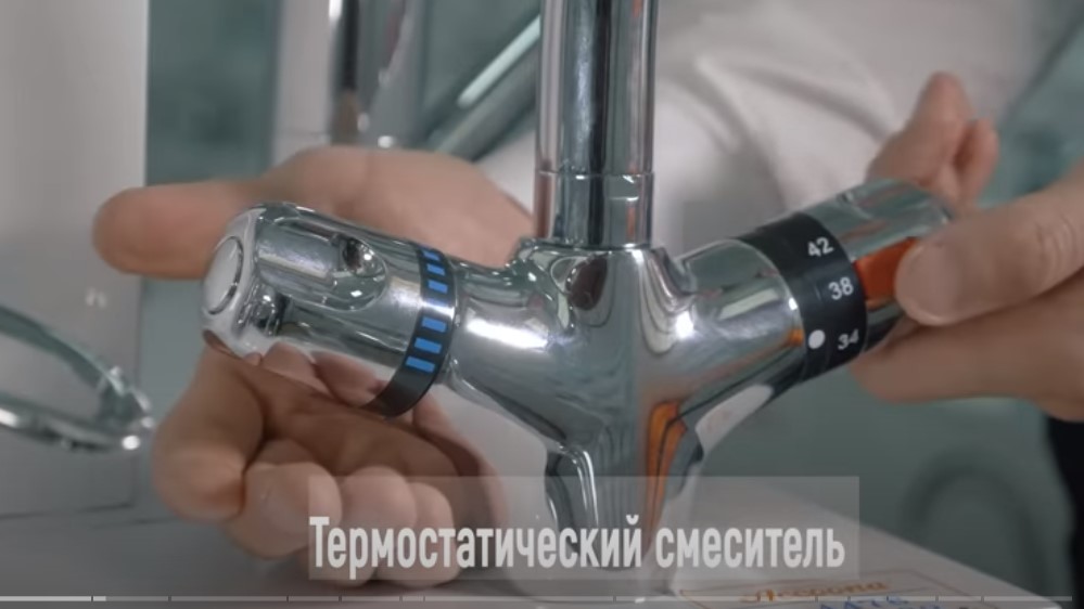 Більш сучасний і складніший вид. Головний принцип роботи термостатичного змішувача полягає у підтримці постійної температури змішаного потоку води незалежно від перепадів тиску в системі загального водопостачання. Головний вузол термостатичного змішувача – термостатичний картридж. Серцем термостатичного картриджа є розширюючий матеріал, що складається з кількох видів воску та інших складових. У разі підвищення температури восковий вміст розширюється і тисне діафрагму. Пружина, що підтримує, забезпечує повернення діафрагми у зворотному напрямку при зниженні температури води. Швидкість спрацьовування термостата коштує від 0,3 до 3 секунд. Змішувач самостійно підмішує холодну або гарячу воду в залежності від того, в який бік стався перепад тиску в системі водопостачання. Таким чином, споживач на виході отримує рівну стабільну комфортну температуру води. Найчастіше перепад тиску холодної чи гарячої води у тому, що це елементи споживання - змішувачі, унітаз, пральна і посудомийна машина запитані на лінії водопостачання послідовно. Внаслідок цього, відкриття чи закриття води будь-якій ділянці споживання впливає всю систему загалом. Простий приклад людина приймає душ. Він налаштовує воду необхідної температури та сили напору. В цей час на іншій ділянці споживання людина включає кухонний змішувач, відбувається перепад тиску, який впливає на всі налаштування першого споживача.Безперечною перевагою даного типу змішувача є величезна економія води, оскільки відсутня час для налаштування температури та сили води вручну. Недоліками цього змішувача є неможливість ремонту без залучення спеціаліста і досить висока вартість.