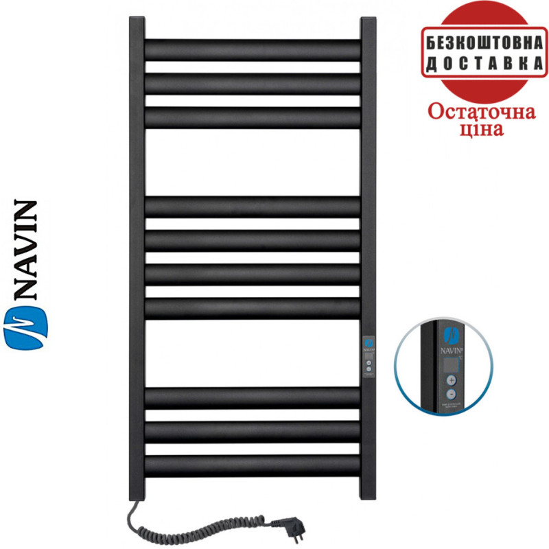 Сушка для рушників електрична Ellipse 50*100 Digital, таймер чорний муар (NAVIN), Україна Виробнича фірма «NAVIN» з 1998 р. займає провідну позицію у виробництві сушки для рушників з вуглецевої сталі на всій території України, і експортується в країни СНД а також Молдову і Швецію в Польщу, Латвію і Угорщину і Великобританію. Виробництво NAVIN знаходиться в м. Біла Церква в Україні.Електрична сушка для рушників Ellipse, колектори якого виконані з профільної квадратної труби 30х30 мм, а перемички з овальних трубок 40х10мм, що надає йому монументальності форми. Прямі лінії у поєднанні з овальними перемичками створюють модний та оригінальний дизайн.Модель "Ellipse" відрізняється елегантним дизайном та багатофункціональною формою. Дуже зручна та багатофункціональна в експлуатації відмінно справляється із обігрівом ванної кімнати, чудово впишеться у Ваш сучасний інтер'єр завдяки своїм елегантним формам у поєднанні з високою практичністю.Сушка для рушників Ellipse 50*100 Digital таймер від українського виробника NAVIN виготовлена з вуглецевої сталі, яка відрізняється високою якістю і міцністю. Товщина стінки стійок і перемичок рушникосушарки становить 1,5 мм.